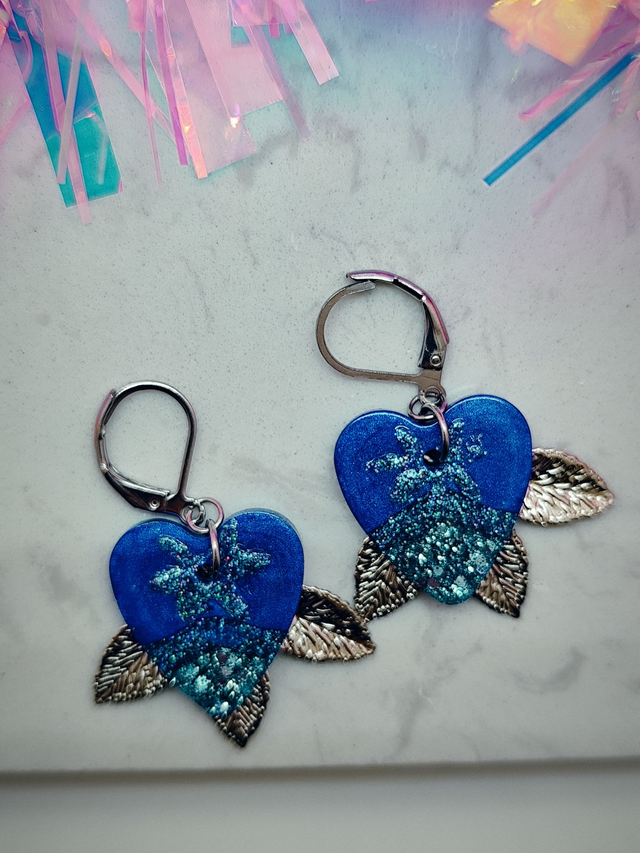 Boucles d'oreilles cœur modèle Cupidon taille S argenté. Teintes liées au bleu.