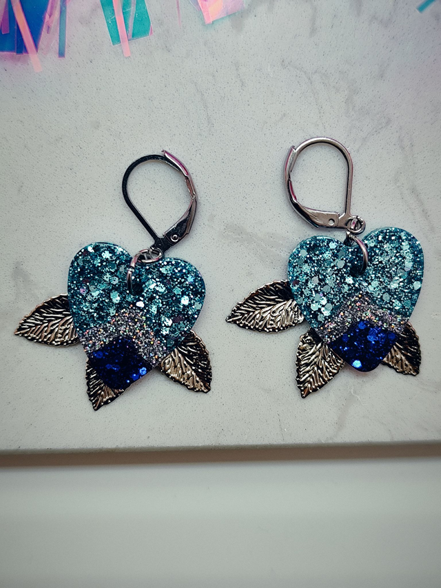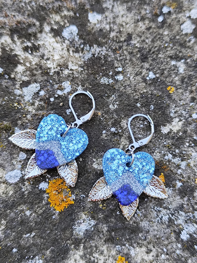 Boucles d'oreilles cœur modèle Cupidon taille S argenté. Teintes liées au bleu ciel.