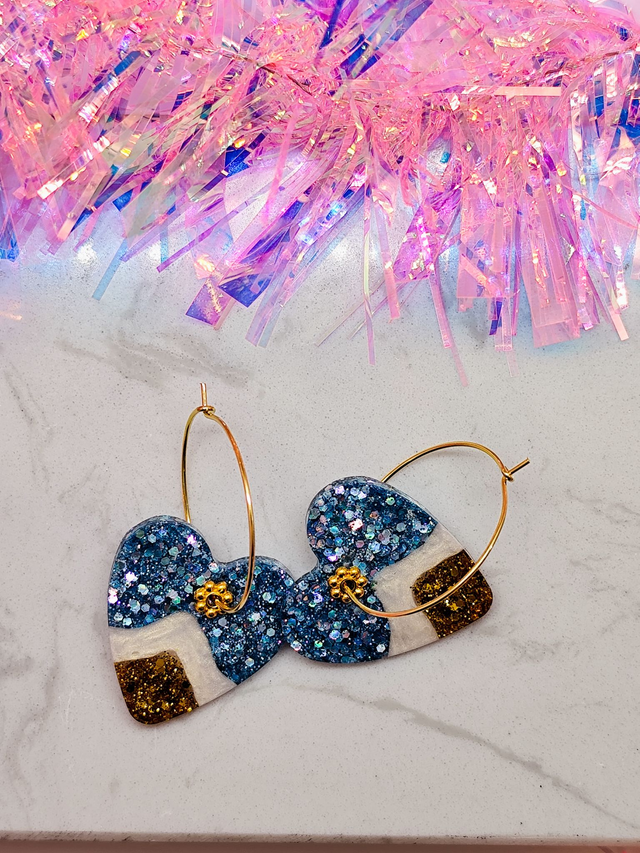 Boucles d'oreilles cœur modèle Cupidon taille M. Teintes liées au doré et bleu.