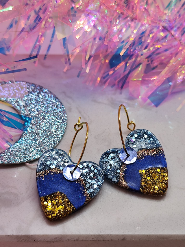 Boucles d'oreilles cœur modèle Cupidon taille M. Teintes liées au doré et bleu.
