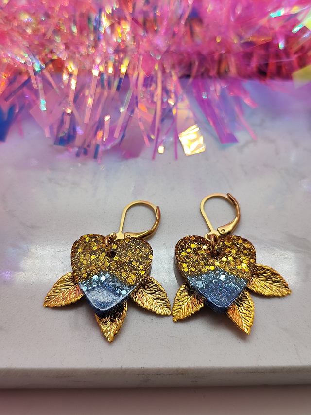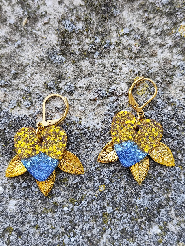 Boucles d'oreilles cœur modèle Cupidon taille S. Teintes liées au bleu et doré.