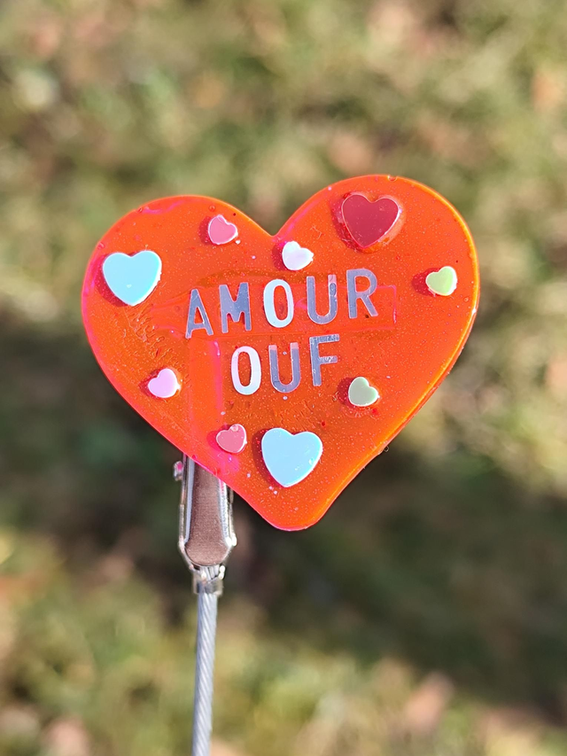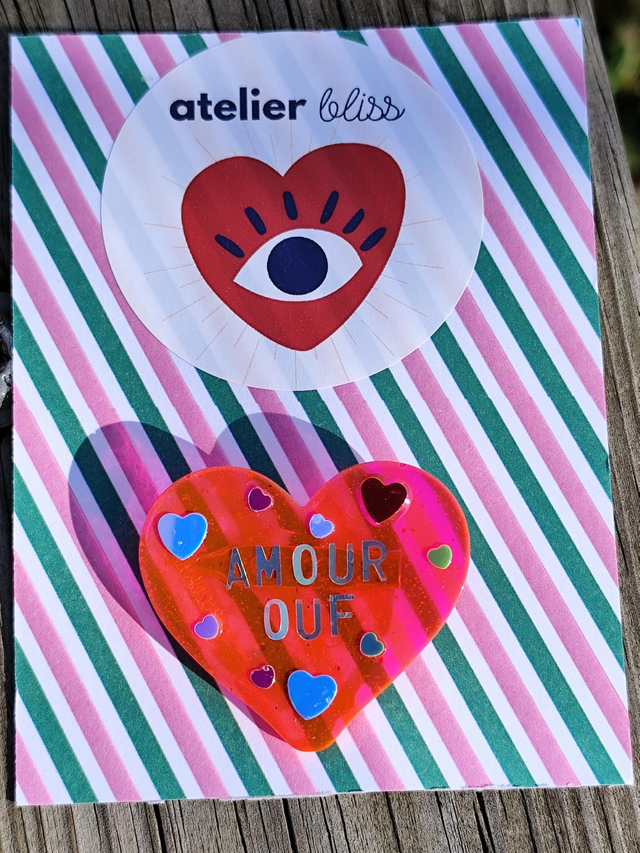 Broche Amour ouf – broche en résine pailletée, pièce unique