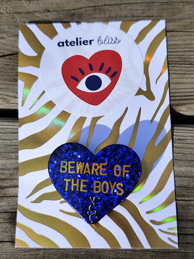 Une broche en résine pailletée qui fait sourire… et réfléchir. Beware of the boys est une pièce unique, artisanale, à porter comme un avertissement élégant (ou pas).