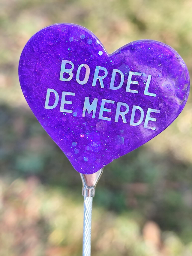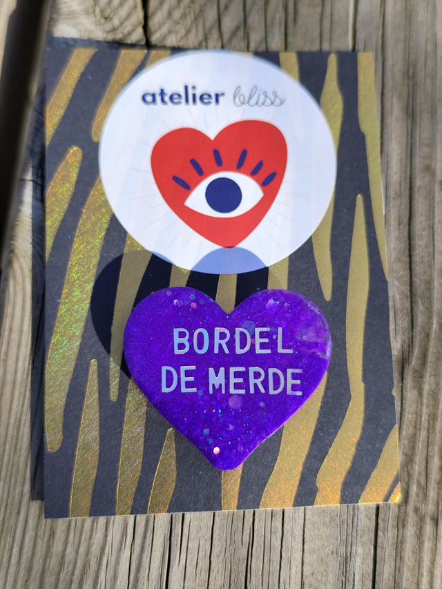 Une broche en résine pailletée qui dit tout haut ce que tout le monde pense tout bas. Bordel de merde, c’est l’accessoire cathartique par excellence, fabriqué à la main, en un seul exemplaire (évidemment).