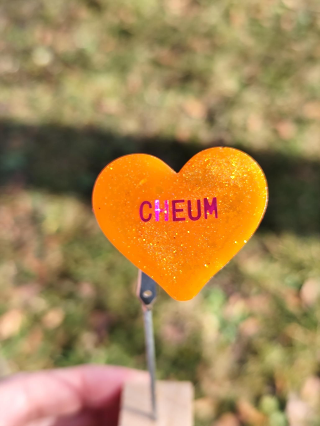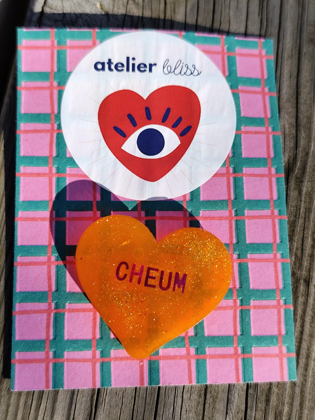 Auto-dérision activée. La broche Cheum joue avec les codes et les clichés, pour mieux les détourner. Une broche artisanale en résine pailletée, unique, pour celles qui préfèrent rire plutôt que se justifier.