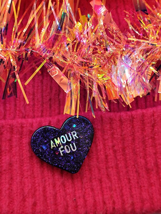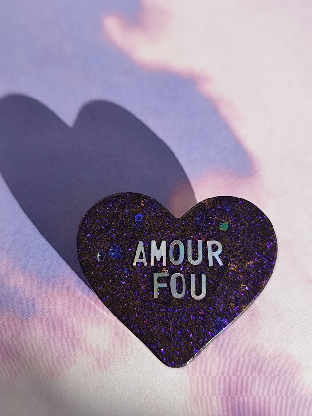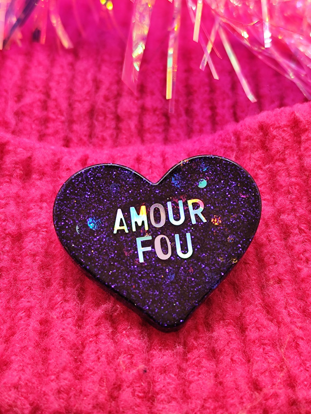 Broche en résine UV violet foncée avec le message AMOUR FOU.