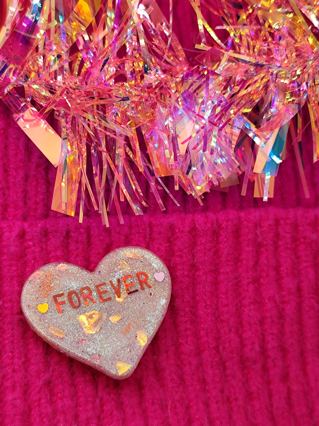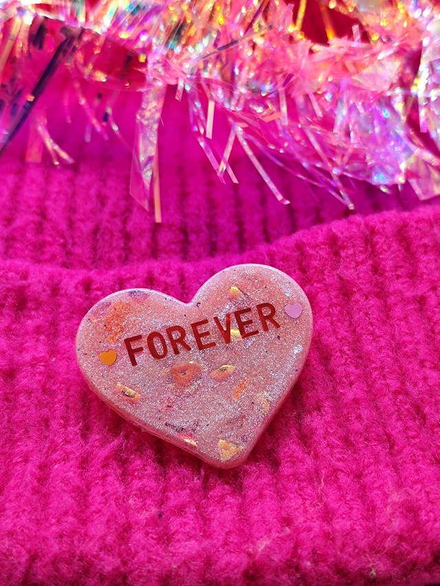 Broche en résine UV orange pâle avec le message FOREVER, pour celles et ceux qui croient en l'amour éternel.