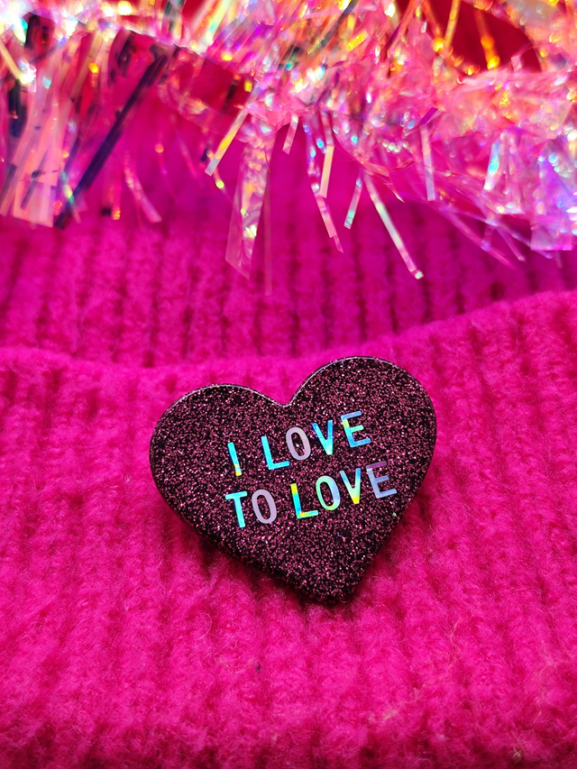 Broche cœur à paillettes - message : I LOVE TO LOVE
