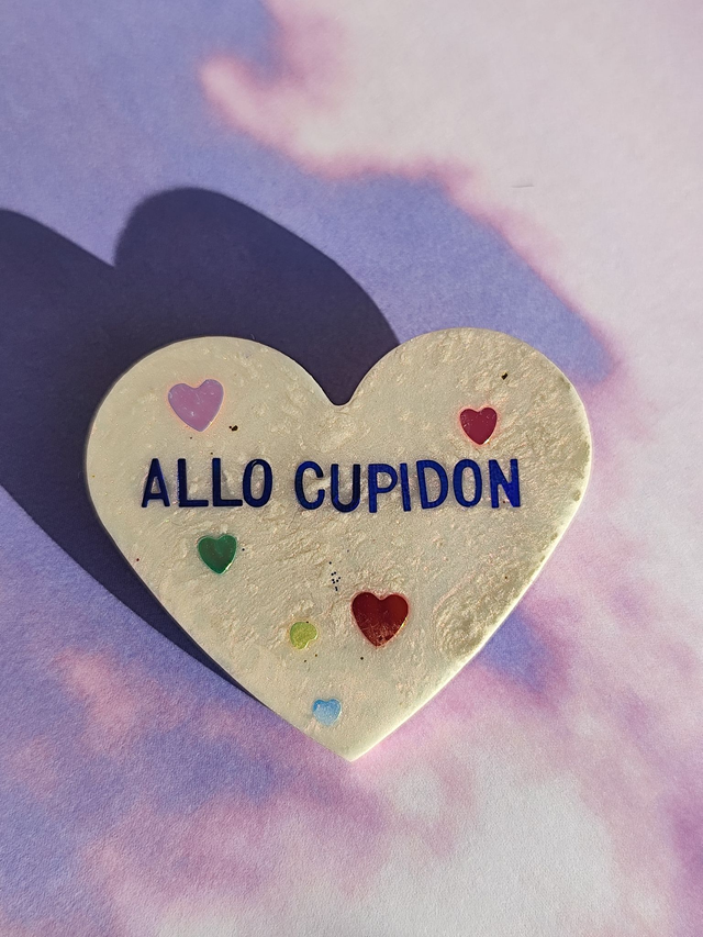 Broche en résine UV violette pailletées avec le message ALLO CUPIDON.