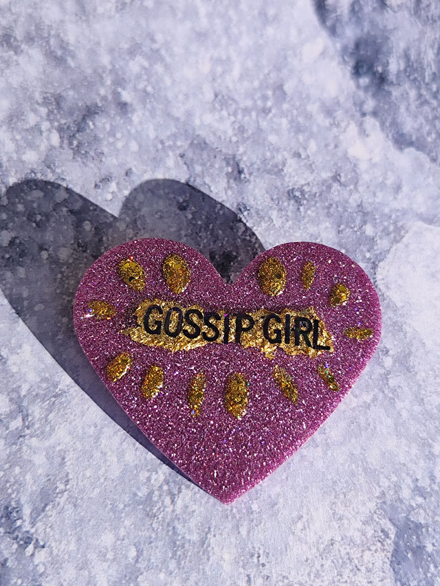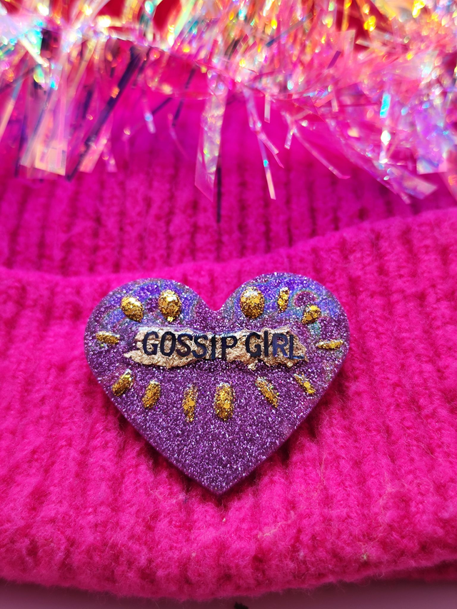 Broche en résine UV violette pailletée avec le message GOSSIP GIRL.